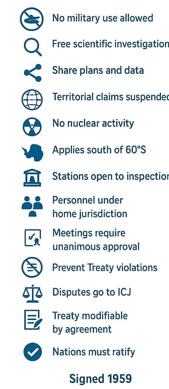 Core Principles of the Antarctic Treaty: Over the decades, the Treaty has expanded into the Antarctic Treaty System, a comprehensive framework guiding environmental protection, science, and international collaboration. The Antarctic Treaty is built on 14 articles that ensure: