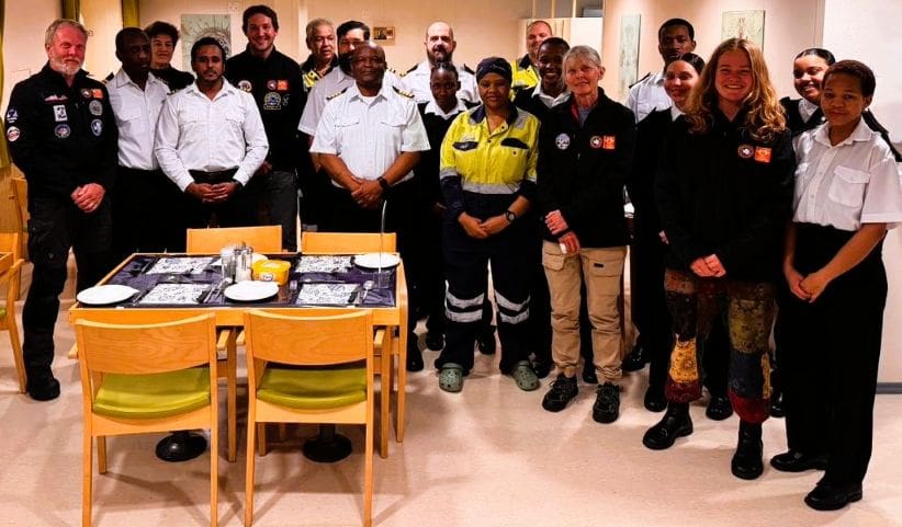 The voyage south is safely guided by the Captain Roland Clutties and crew of the S.A. Agulhas II, whose expertise navigating the Southern Ocean and pack ice ensures the secure transport of passengers, fuel, equipment, and supplies. Onboard, the chefs and stewards keep teams energised with warm meals throughout the journey. Meanwhile, bulldozer operators and mechanics prepare for ice-shelf operations and CAT train traverses that will move bulk cargo inland to the station once the ship reaches the ice edge. (Photo, Captain with part of off duty crew and UJ reserach team)