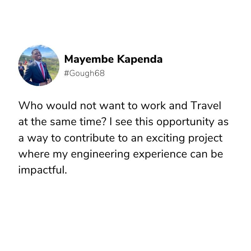 G68 Team (Left to Right): Lucy Dorman, Joyfull Ntobeko Gaju (removed from the team and replaced with G67 Medic, Sandile Nkebe), Philani Siyabonga Ngcobo (removed from the team and replaced with G67 Assistant Meteorological Technician, Tshililo Kharivha), Sibusiso Maduna, Rebekah Goodwill, Mphumzi Brooklyn Zilindile, Eddy Mfezeko Xaki, Khuliso Collen Maphaha, Mayembe Kapenda.
