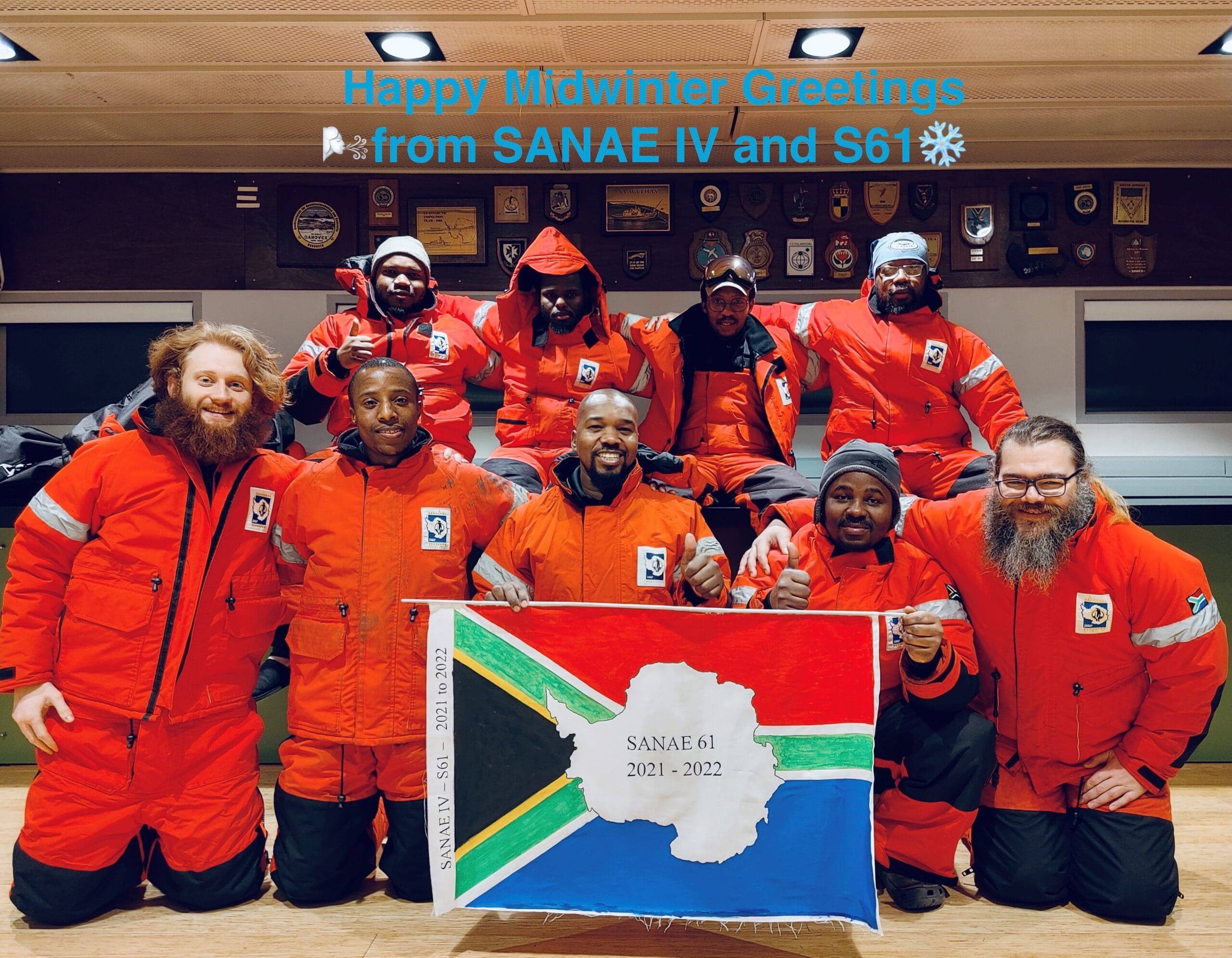 Midwinter greetings from the 61st SANAE Overwintering Team, on Antarctica.