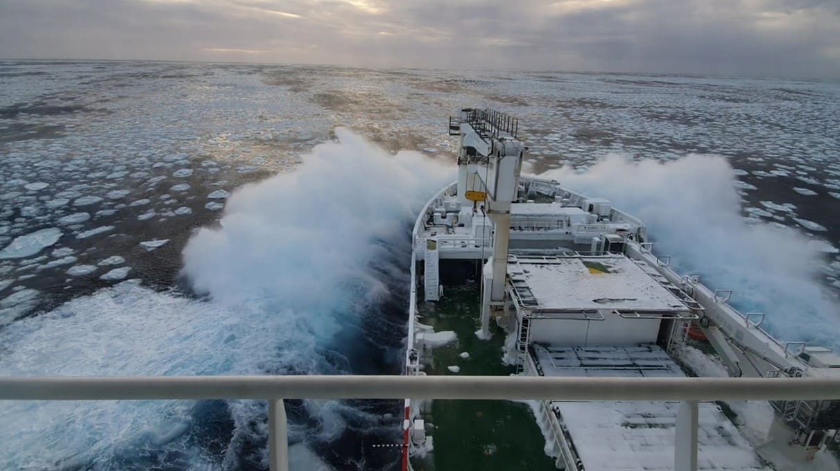 The S.A. Agulhas II in a bow slam while in the marginal ice zone (MIZ). Photo Credit: Nicole Taylor.