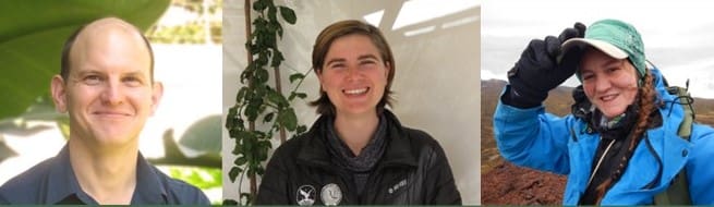 Another student Janine Schoombie of Peter le Roux of University of Pretoria presented in the ad hoc session chaired by Christel Hansen. They only arrived on 30 November after the Prince Edward Island scientific voyage. “Studies of wind, plants and seabirds on Marion Island”. (Abstract) A poster presentation by Elsa van Ginkel , student of Peter le Roux “Examining the potential for entomophilous pollination on sub-Antarctic Marion Island” was mentioned in the ad hoc session.(Abstract) (Above l-r: Peter le Roux, Janine Schoombie, Elsa van Ginkel)