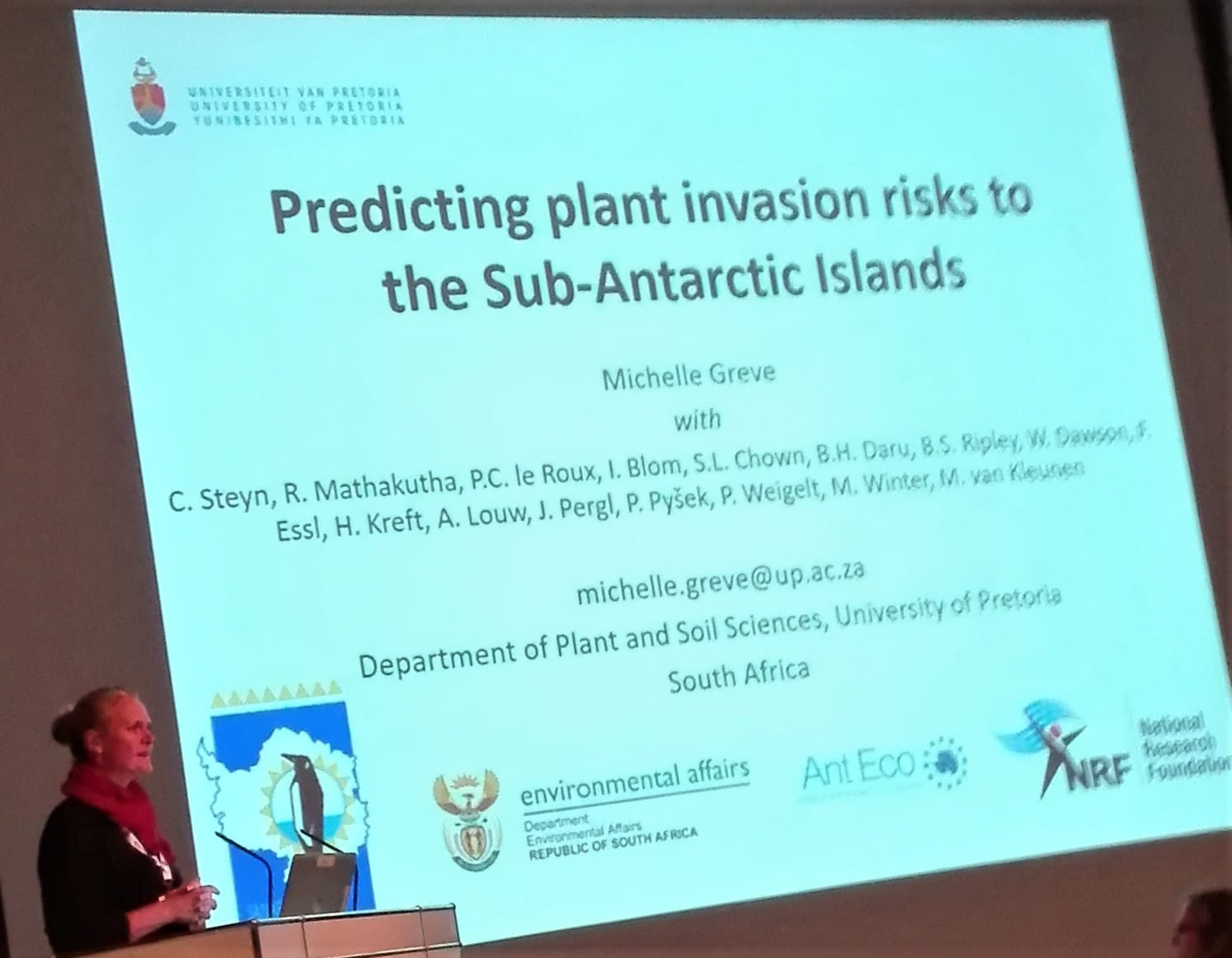 Much of the work that we have been doing on Marion Island deals with invasive species (especially plants) and what determines their distribution and success. Even though sub-Antarctic islands like Marion Island are some of the most isolated places on Earth, they have not been totally spared from human activities. Invasive species constitute one of the largest threats to the islands. These have mostly been introduced accidentally in e.g. building rubble, stuck in people’s shoes or the Velcro of their jackets, or in food supplies. Not all exotic species that have arrived at the islands have survived, but those that have, have often managed to spread and in some cases have had large negative impacts on the native species and ecosystem. Additionally, Marion Island is rapidly warming, and this is benefitting invasive species which are able to better survive under the mild conditions. How invasive species will be affected by climate change compared to native species forms a further particular interest. There is already some evidence of invasive species benefitting more than native species; but together with Prof Michael Cramer from UCT and Brad Ripley from Rhodes University, we are also studying how factors other than climate, e.g. soil characteristics, may limit the spread of invasive species, even under climate change. (image below during The POLAR2018 symposium in Davos, Siwtzerland)
