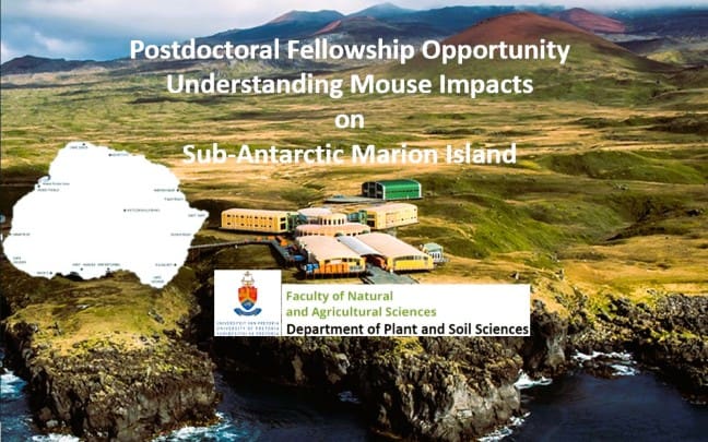 An exciting postdoctoral fellowship is offered on our South African National Antarctic Programme project “Towards a comprehensive understanding of impacts of the invasive house mouse on the terrestrial biodiversity of Marion Island”. Sub-Antarctic Marion Island is one of the most isolated landmasses globally. The house mouse invaded the island in the early 1800s, and its impacts are manifold, and intensifying under climate change. This project aims to fill gaps in understanding mouse impacts on the island, with the purpose of informing the planned mouse eradication. This position will provide exciting opportunities to work on excellent long-term and/or spatially well-sampled datasets and inform island management.